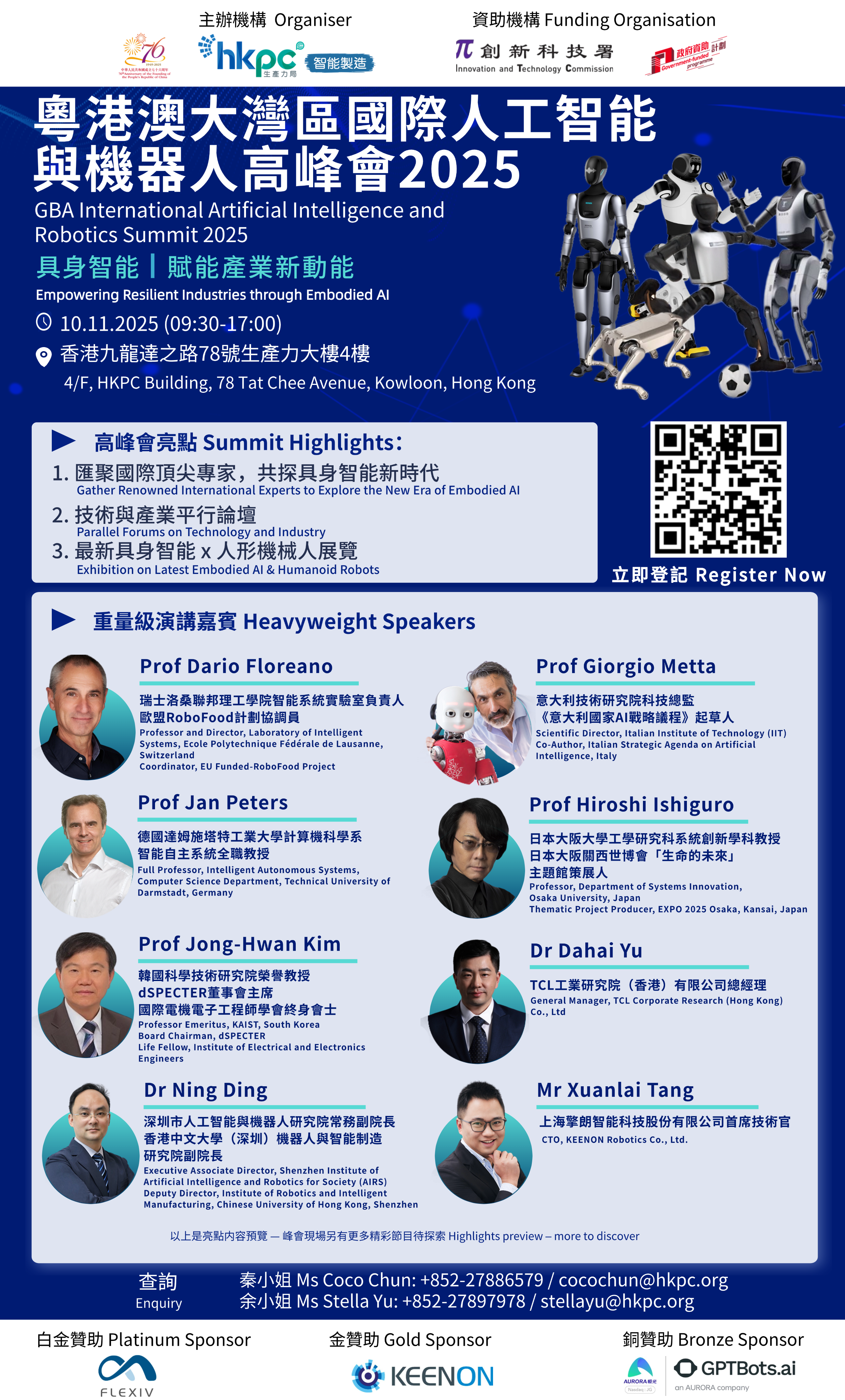 The "GBA International Artificial Intelligence and Robotics Summit 2025" will be grandly held on November 10. Building on last year's enthusiastic response, this year's event returns with an even larger scale and a stronger lineup, with the theme "Empowering Resilient Industries through Embodied AI." It will bring together top experts from Switzerland, Germany, Italy, Japan, South Korea, and China.